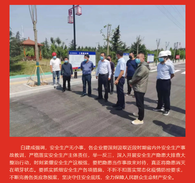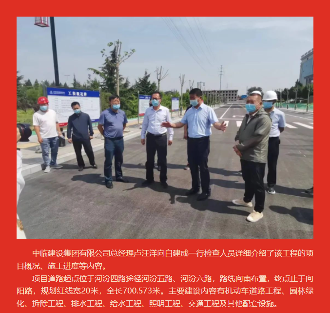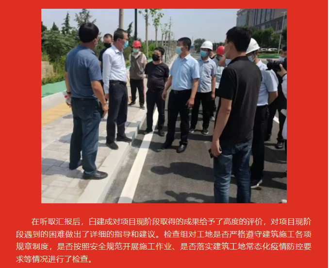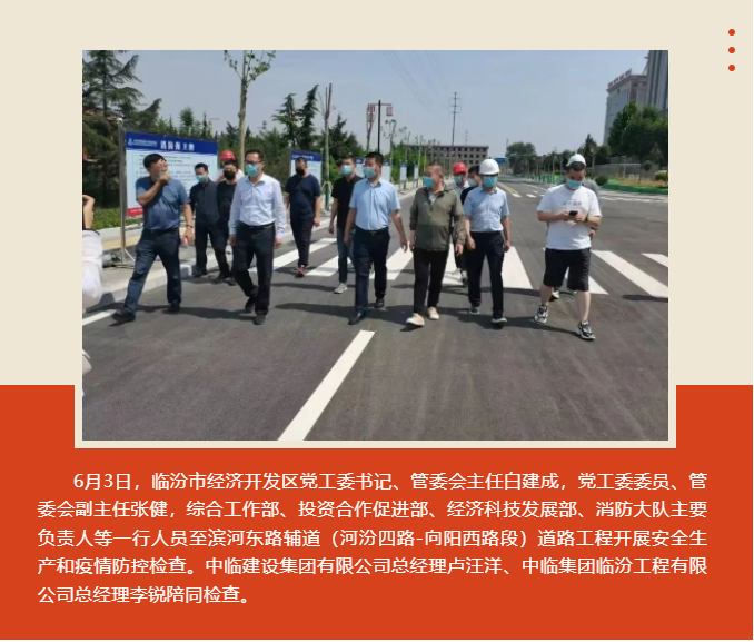 临汾市经济开发区党工委书记、管委会主任白建成一行到滨河东路辅道(河汾四路-向阳西路段)道路工程开展安 全生产和疫情防控检查